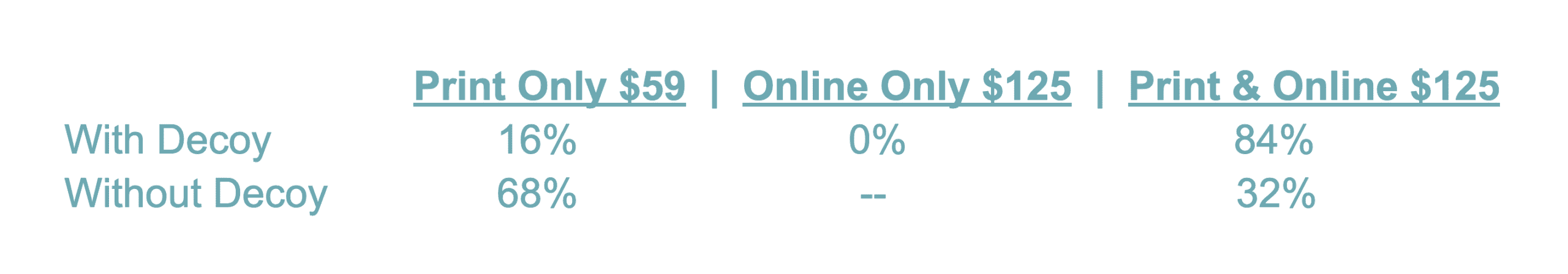 Note Ariely’s results from selling The Economist subscriptions below, and how they changed when the decoy was removed.